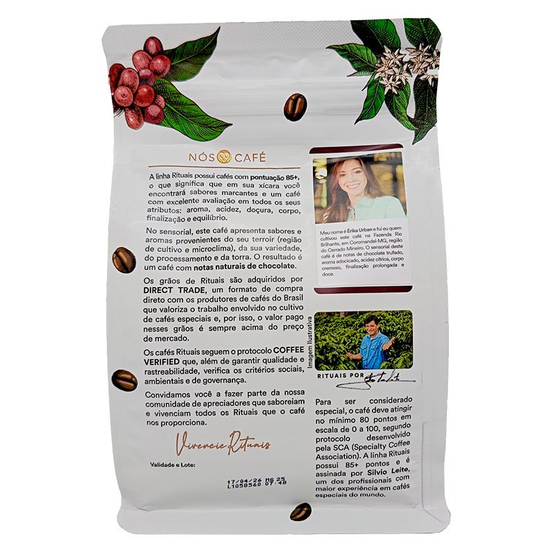 Rituais Chocolate combina granos arábicos seleccionados de las regiones brasileñas de Cerrado Mineiro y Sul de Minas, zonas reconocidas por su clima ideal y suelos ricos que aportan matices de chocolate, caramelo y un leve toque de nuez.